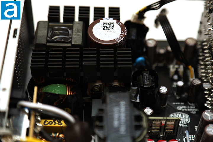 On the primary side, we can see one Japanese brand Nippon Chemi-Con capacitor. 100% Japanese brand capacitors are specified on the marketing material, so this is to be expected. Our 850W version of Cooler Master's latest XG-series power supply incorporates one 680µF x 450V capacitor. It is rated at 105c; whereas more value-oriented power supplies usually use 85c rated capacitors.