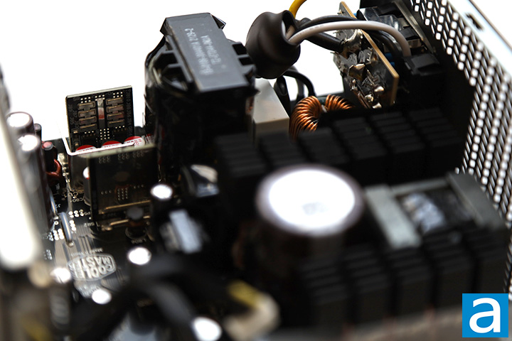 The active PFC circuit featured on the Cooler Master XG850 Plus Platinum 850W uses two MCC GBU15KL bridge rectifiers attached to opposite sides of the first heatsink. At 115V, the maximum rectified forward current capacity with heatsink is 15A each, so you can theoretically pull up to 3450W (15A * 2 diodes * 115V) from the bridge rectifier at 100% efficiency. Of course, this is limited by the fact that it is not 100% efficient and also neglects the fact that not every component in the system is able to keep up.