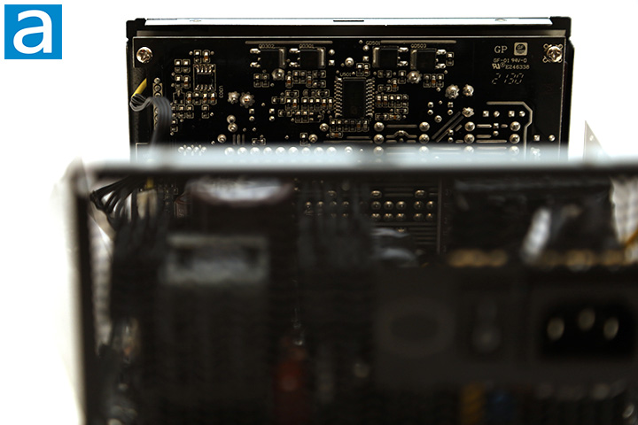 At the back, we have a large daughterboard covering the entire rear panel for the modular cable sockets. Two Excelliance MOS EMB04N03 and two Excelliance MOS EMB07N03 MOSFETs located here generate the +5V and +3.3V output from the +12V rail. The EMB04N03's rated continuous drain current is 55A at 100c. It has an RDS(on) value of 4.0 mΩ maximum and 3.2 mΩ typical. The EMB07N03's rated continuous drain current is 17A at 100c. It has an RDS(on) value of 7.0 mΩ maximum and 5.5 mΩ typical. ANPEC's APW7159C is the PWM switching controller. The datasheets for all components mentioned in this review can be found on their respective manufacturer's websites.