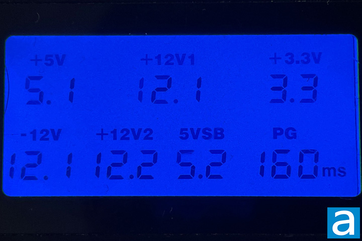 Voltages with minimal load are generally accurate, which is a basic requirement of power supplies out of the box. In this situation all are within 4%. The Power Good or PG delay is tested at 160ms, which is compatible with Non-Alternative Sleep Mode per ATX specifications. This power supply officially supports Alternative Sleep Mode, so it is likely the PSU tester I used was not fast enough to pick up the true PG signal. The ATX design specifications state a PSU's PG is required to be between 100ms and 500ms, with 250ms maximum for Non-Alternative Sleep Mode and 150ms for Alternative Sleep Mode.