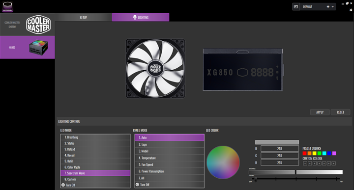 The Cooler Master XG850 Plus Platinum 850W works along with a version of MasterPlus+, which is a 315MB download from the company's website at press time. This program unifies many Cooler Master products into one application, but check the website first for compatibility. Once the program opens, it will immediately detect the products you own. All settings are stored on the PSU's internal memory, so MasterPlus+ does not need to be running to maintain your custom configuration.