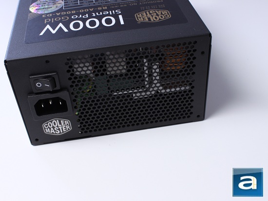 The dark, matte-textured finish on the Cooler Master Silent Pro Gold gives the power supply a nice slick look in my opinion. It gives it a very classy and mature appearance, especially considering it has no flashy LED lights included. A 135mm bottom mounted fan gives the Silent Pro Gold good internal airflow at slower speeds for low noise emissions. A honeycomb mesh is implemented for low air impedance without additional fans to optimize silence. A standard on/off switch is located at the back, just above the male connector, for AC power input. Like most power supplies these days, the Cooler Master Silent Pro Gold 1000W has automatic full range 100V-240V AC line voltage selection, so the user do not have to select the input voltage manually.