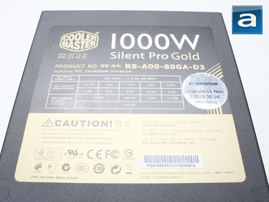 Located clearly on the front side of the power supply is the power output/rail configuration information label, which has the miscellaneous certifications and patents printed on it as well. Although Cooler Master is able to design such a high performance power supply, it is kind of funny because their English skills lack proficiency (Look who's talking, haha. :P - Editor). On the label, it states that "AS SEALED STICK WAS REMOVED, LOST, OR DAMAGED, IT SHALL BE OUT OF WARRANTY VALIDITY". In plain layman's English, it simply means opening the power supply voids its warranty. The maximum DC power is rated at 1000W, with 1200W maximum for boost (The overload is useful, because starting the computer temporarily requires more power; once it stabilizes the power consumption returns to normal levels). Theoretically, the +3.3V rail provides 72.6W by itself, and the +5V rail provides 125W, as obtained from the formula, P=IV. The +3.3V and +5V rails total an output of 150W. The +12V rail is one big fat one for minimal operating overhead, and provides a single maximum DC output of 984W. The combined maximum for all the rails on the Silent Pro Gold 1000W is 1000W, hence the name, haha.