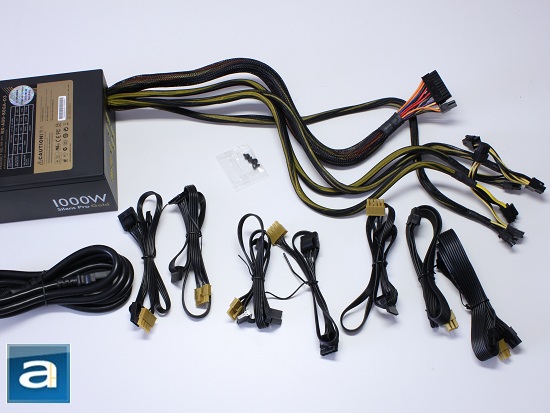 As aforementioned, the 20+4 pin motherboard, two 4+4 pin CPU, one 6+2 pin PCI-e, and one 6 pin PCI-e connectors are fixed to the Silent Pro Gold. These cables are fully sleeved and soldered neatly onto the board of the Cooler Master Silent Pro Gold 1000W. This can be seen on the subsequent page. Most of the modular cables are the flat type as shown in our photo above, making them easier to manage when working with the power supply in your chassis. It is beneficial because the cables are not likely be easily tangled into a big mess -- even when you're hooking them up with multiple hard drives, optical drives, video cards, and the like.