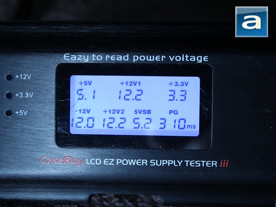 Using our power supply tester which exerts minimum load on the power supply, the initial power consumption was 12W, meaning that its basic load-free power is slightly higher than average. The Cooler Master Silent Pro Gold 1000W is an 80 Plus Gold certified power supply; hence the name. To be 80 Plus Gold certified, the product has to be at least 87% efficient at 20% load, 90% efficient at 50% load, and 87% efficient at 100% load. This makes the Silent Pro Gold an extraordinarily efficient PSU. Voltages at minimal load are pretty accurate as well. All were within 0.3V spec; with the PG (Power Good) delay of 310ms, as obtained from our meter.
