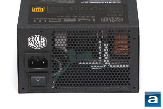 Starting from the back part of the power supply, we have the same familiar honeycomb mesh design like most PSUs with bottom mounted fans; and the standard on/off switch located below the male connector for power input on the western edge. The low resistance honeycomb mesh design is implemented to maximize airflow and minimize air resistance. This is done as heat needs to leave the power supply as easily and efficiently as possible, because the Cooler Master Silent Pro Hybrid 1050W incorporates only one 135mm fan at the bottom, with no auxiliary fans. However, I think the design can be a little more efficient, as the power input and switch panel occupies nearly a quarter of the rear exhaust area. Reducing the size of the on/off switch and deleting the Cooler Master logo would probably help. As with most new power supplies, the Cooler Master Silent Pro Hybrid 1050W has an automatic full range (100V-240V) AC line voltage selection, so the user does not have to worry about manually selecting input voltage.