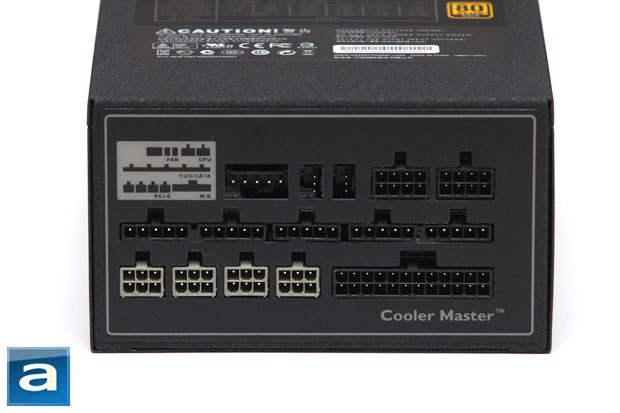 The rear cable connection panel is done nicely. Similar connectors are grouped together; and are laid out in a very logical manner. To ensure you know what is going on, a diagram is situated in the upper left corner for minimal ambiguity. The stuff you might not be familiar with are probably the connectors adjacent to the connector diagram as aforementioned. Actually, the first one is a proprietary port to the included front panel fan controller; as for the two next to it that looks like a 3-pin fan header -- that's pretty much what it is. Continued from that point on, from left to right and top to bottom, we have two ATX 4-pin/EPS 8-pin connectors, five Molex/SATA connectors, four PCIe 8-pin connectors, and one ATX 24-pin connector. Incompatible outputs will not physically fit into each other, so I think Cooler Master has done a great job in this regard. This generous array of available connectors should be more than sufficient for casual users and power enthusiasts alike.