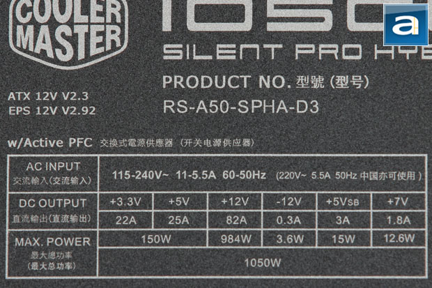 The voltage specification label at the top of the Cooler Master Silent Pro Hybrid 1050W. There are two main virtual rails. Up to 22A can be delivered via the +3.3V rail for a total of 72.6W; while 25A on the +5V rail brings the output to 125W in this area. The total combined output for the +3.3V and +5V rail is 150W. In other words, your power allocation combination must fall within the limits of the listed specifications. Meanwhile, a single powerful +12V rail delivers up to 82A (984W) to reduce operating overhead compared to multiple +12V rails. Overall, the combined power output for the whole Silent Pro Hybrid is... well, 1050W haha. Again, your power distribution in your system must fall within the limits provided -- it must not exceed 72.6W on the +3.3V rail, 125W on the +5V rail and 150W combined for both, 984W on the +12V rail, and 1050W combined between the +12V and +3.3/+5V rails. It does sound a bit confusing to understand how this works at first, but generally speaking this configuration allows very flexible power demands and should be sufficient to accommodate most users. On the other hand, I have seen lower wattage PSUs with more power on the +5V rail, so I would actually expect a little more in this area for a 1050W power supply unit.