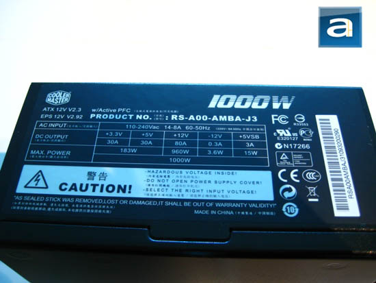 Located on the left side of the power supply is the power output/rail configuration information label. This includes data on the rails (No kidding, haha), and of course some of those assorted certifications and patents. The funniest thing here is the Engrish statement, "AS SEALED STICK WAS REMOVED, LOST, OR DAMAGED, IT SHALL BE OUT OF WARRANTY VALIDITY". (Google Translate? Haha - Editor) In summary, by opening the power supply, you void the warranty. Well, at least that is what I think it means anyway. At least on paper, we can see how powerful the Cooler Master Silent Pro M 1000W is specified to be. Combined maximum continuous DC power output for this power supply is rated at 1000W, and 1200W maximum for boost. Sometimes more power may be necessary upon initial system boot, or just a temporary burst or spike in usage. The +3.3V rail and +5V rail has a combined output of 183W. Separately, the +3.3V rail theoretically gets a maximum output of 99W; while the +5V rail theoretically gets a maximum output of 130W. Both calculations were done with the following common power formula: P=IV. The +12V rail is notably not split into virtual rails, giving a single +12V rail providing a maximum DC output of 960W. This is excellent, since there is significantly less overhead to maximize efficiency and available power. All in all, the maximum continuous DC power output is limited to "only" 1000W continuous and combined.