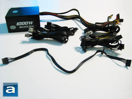Only three cables are not modular; instead they are hardwired into the power supply. The three cables consists of the 4+4 pin ATX12V cables (They're technically two cables; usually combined for one 8-pin EPS block where necessary), and one 20+4 pin motherboard connector. The rest of the cables are modular. There is room for six 6+2 pin PCIe cables, and five Molex/SATA output connectors, at the back of the power supply. Talk about a loaded power supply, it can take anything you throw at it physically 3-Way SLI? No problem, the Cooler Master Silent Pro M 1000W is here to accommodate anything you may need it to. And up to 1000W rated power output to boot!