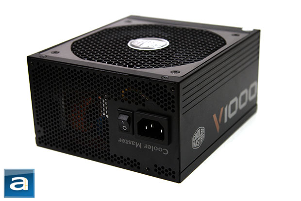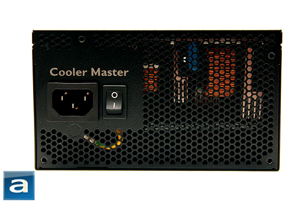 Starting from the back part of the power supply, we have the same familiar honeycomb mesh design like most PSUs with bottom mounted fans; and the standard on/off switch located on the right side of the male connector for power input on the western edge. The low resistance honeycomb mesh design is implemented to maximize airflow and minimize air resistance. This is done as heat needs to leave the power supply as easily and efficiently as possible, because the Cooler Master V1000 1000W incorporates only one 135mm fan at the bottom, with no auxiliary fans. However, I think the design can be a little more efficient, as the power input and switch panel occupies nearly a quarter of the rear exhaust area. Deleting the Cooler Master logo and all the blank space around it would probably help. As with most new power supplies, the Cooler Master V1000 has an automatic full range (100V-240V) AC line voltage selection, so the user does not have to worry about manually selecting input voltage.