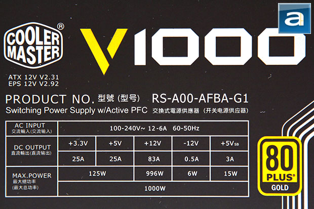 The voltage specification label at the top of the Cooler Master V1000 1000W. There are three main virtual rails. Up to 25A can be delivered via the +3.3V rail for a total of 82.5W; while the same 25A on the +5V rail brings the output to 125W in this area. The total combined output for the +3.3V and +5V rail is also 125W. In other words, your power allocation combination must fall within the limits of the listed specifications. Meanwhile, a single powerful +12V rail delivers up to 83A (996W) to reduce operating overhead compared to multiple +12V rails. Overall, the combined power output for the whole V1000 is... well, 1000W haha. Again, your power distribution in your system must fall within the limits provided -- it must not exceed 82.5W on the +3.3V rail, 125W on the +5V rail and 125W combined for both, 996W on the +12V rail, and 1000W combined between the +12V and +3.3/+5V rails. It does sound a bit confusing to understand how this works at first, but generally speaking, this configuration allows fairly flexible power demands and should be sufficient to accommodate most users. On the other hand, I have seen lower wattage PSUs with more power on the +5V rail, so I would actually expect a little more in this area for a 1000W power supply unit.