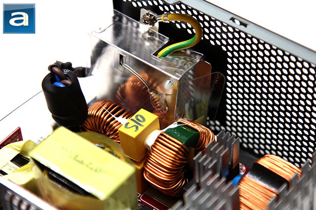 A quick tug on the shell, and we got straight to the internal inspection. The transient filter stage is the first input stage of a computer power supply, so we will take a look at that first. Cooler Master has always done a great job in the past to make sure their premium power supplies met or exceeded the recommended requirements, and the Seasonic based V1000 is no exception. The Cooler Master V1000 1000W has three ferrite coils, one metal oxide varistor, three metalized polyester X-capacitors, and six ceramic Y-capacitors. This is three times the amount of X capacitors and Y capacitors than recommended. Considering how many modern day PSUs have missing MOVs, I am happy to see it here, as this component is used to stabilize spikes from the AC line along with a TVS diode.