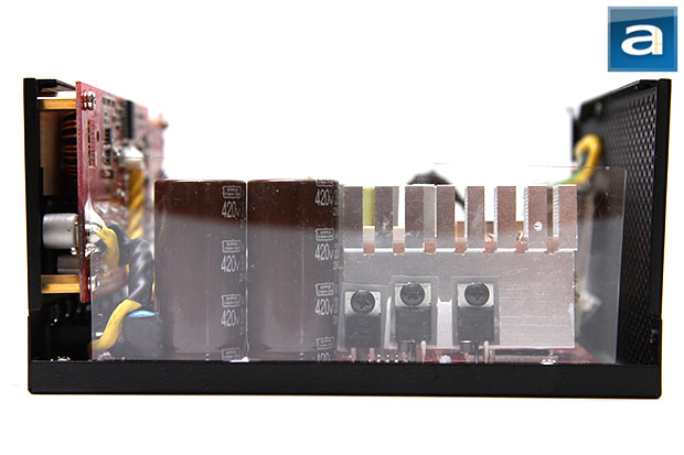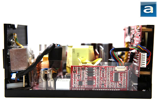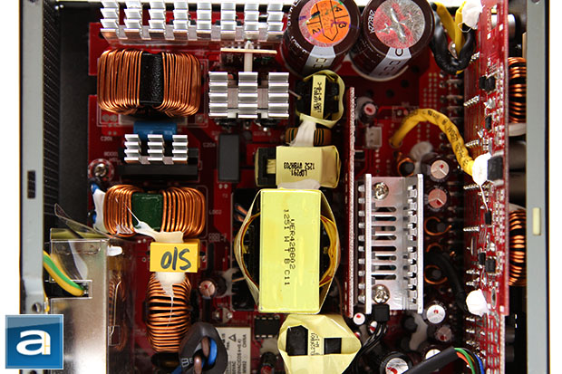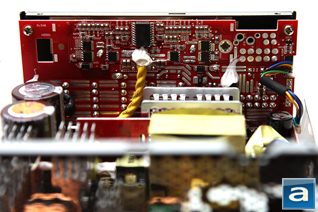 On the secondary side, we can see more Nippon Chemi-Con or Rubycon 105c capacitors. I am pleasantly surprised by this, as most companies usually resort to cheaper Taiwanese 85c units for secondary capacitors. As with modern high efficiency power supplies, all rectifiers produces the +12V out -- while the +5V and +3.3V outputs are generated from the +12V output using a DC to DC converter within the power supply unit. An Infineon CoolSET Q1 ICE2QR4765 offline SMPS quasi-resonant PWM controller with integrated power IC can be seen adjacent to the vertical PCB. The DC-to-DC converter has one ANPEC APW7159 synchronous buck PWM controller. Meanwhile, a Weltrend WT7527V IC provides over current and over/under voltage protection on the vertical PCB. An Advanced Analog Circuits AS393 voltage comparator is found in the same area.