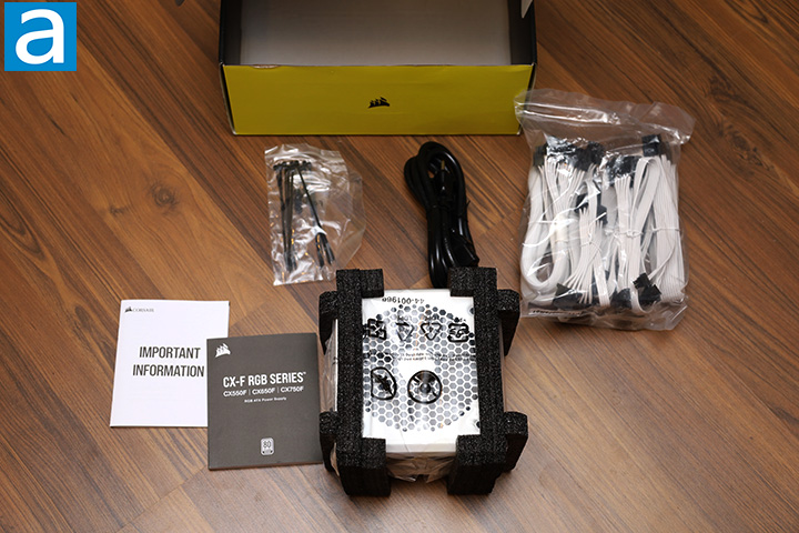 The Corsair CX750F RGB 750W's retail package can be opened by a flap along the bottom. Upon opening the box, you will find the bundle is simple and with a reasonable amount of extras. What you will get is the Corsair CX750F RGB 750W itself inside a bubble wrap bag, four screws, AC power cable, modular cables, RGB connection cable, cable zip ties, and a product manual.