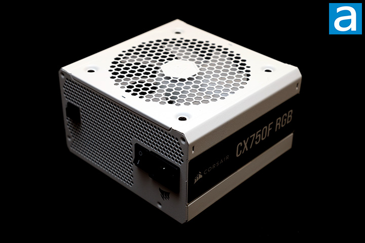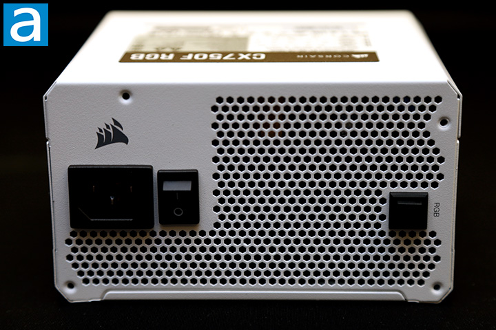 Starting from the back part of the power supply, we have the same familiar honeycomb mesh design as most PSUs with a bottom mounted fan. What you will find here is a horizontally aligned male connector for power input on the western edge along with an on/off switch and a button to toggle RGB lighting on the eastern edge. Holding down the button for about three seconds will cycle to the next lighting mode, while a short press will move to the next color. The PSU will remember the last setting. You will also find Corsair's logo here. The low resistance honeycomb mesh design is implemented to maximize airflow and minimize air resistance. This is done as heat needs to leave the power supply as easily and efficiently as possible, because the CX750F RGB 750W incorporates only one 120mm fan at the bottom. It is also implemented in a reasonably efficient manner as the power input connector and switch took up a relatively small amount of room at the back. As with all active PFC power supplies, the Corsair CX750F RGB 750W has an automatic full range 100V to 240V AC line voltage selection, so the user does not have to worry about manually selecting input voltage.