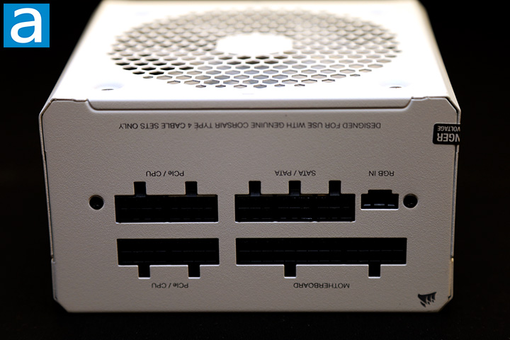The rear cable connection panel is done nicely. Corsair has also made the labels right side up in standard orientation. Similar connectors are grouped together and are laid out in a very logical manner. To ensure you know what is going on, they are all grouped and clearly labeled for minimal ambiguity. On the top left, we have a motherboard 24-pin split into two blocks next to each other. Next, there are four ATX/EPS 4+4 pin or PCI Express outputs. Along the bottom are three peripheral headers for Molex and SATA. Finally, there is an input for RGB LED lighting control. Incompatible outputs will not physically fit into each other, so Corsair has done a great job in this regard. This is a reasonable array of outputs in correspondence number of connectors on each modular cable, which should be sufficient for casual users and power enthusiasts alike.