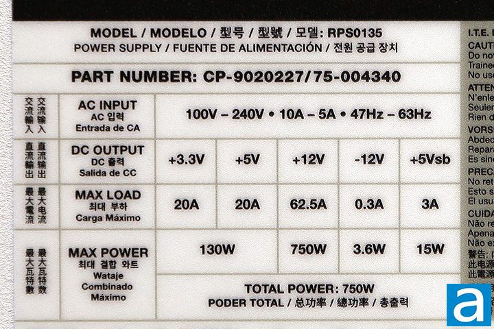 The voltage specification label is located on the outer panel of the Corsair CX750F RGB 750W. There are two main virtual rails. Up to 20A can be delivered via the +3.3V rail for a total of 66W; while the 20A on the +5V rail brings the output to 100W in this area. The total combined output for the +3.3V and +5V rail is 130W. In other words, your power allocation combination must fall within the limits of the listed specifications. Meanwhile, a single powerful +12V rail delivers up to 62.5A -- 750W -- to reduce operating overhead compared to multiple +12V rails. Overall, the combined power output for the whole Corsair CX750F RGB 750W is... well, 750W haha. Again, your power distribution in your system must fall within the limits provided -- it must not exceed 66W on the +3.3V rail, 100W on the +5V rail and 130W combined for both, 750W on the +12V rail, and 750W combined between the +12V and +3.3/+5V rails. It does sound a bit confusing to understand how this works at first, but generally speaking, this configuration allows very flexible power demands and should be sufficient to accommodate most users. I have seen higher power outputs in the +3.3V and 5V rails for lower output rated units, but the overall distribution is still reasonable for a 750W power supply.