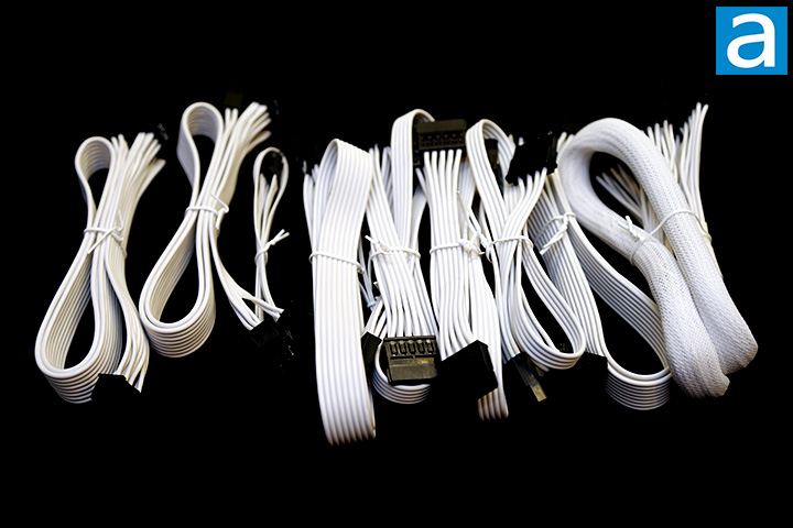 A total of eight modular power cables are included out of the box. All modular cables other than the ATX 20+4-pin cable are flat and easy to bend, making them extremely easy to work with. The ATX 20+4-pin cable is sleeved rather than flat. The thickness of the wires are not labeled.