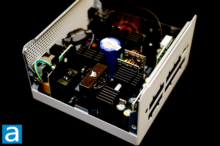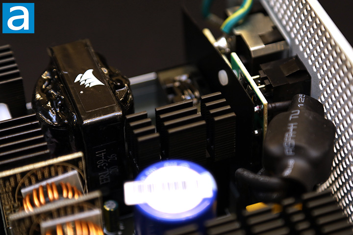 Disassembling the Corsair CX750F RGB 750W is quite straightforward with the removal of four screws behind the labels on the side. Our photo above shows an overhead view of its internal components. Its OEM is HEC, a manufacturer of mostly budget products since 1979. At first glance, the build quality appears to be very good. There are four main heatsinks inside. The two larger ones painted black are located on the primary side, while two smaller sized heatsinks reside on the secondary side.