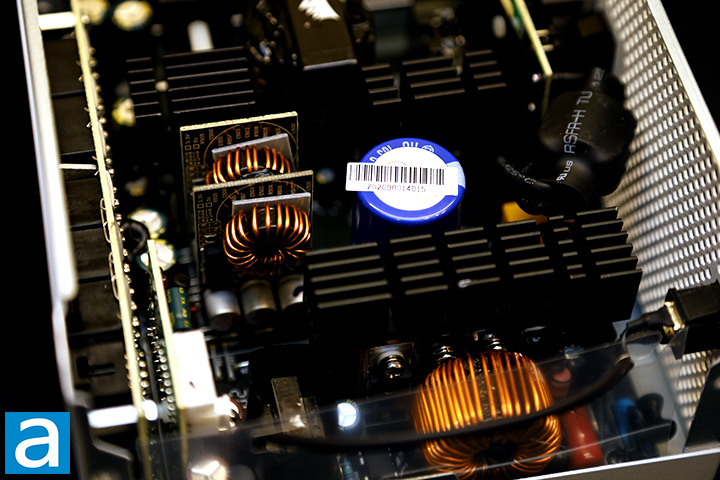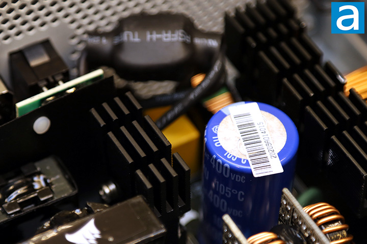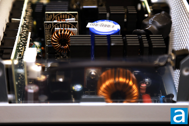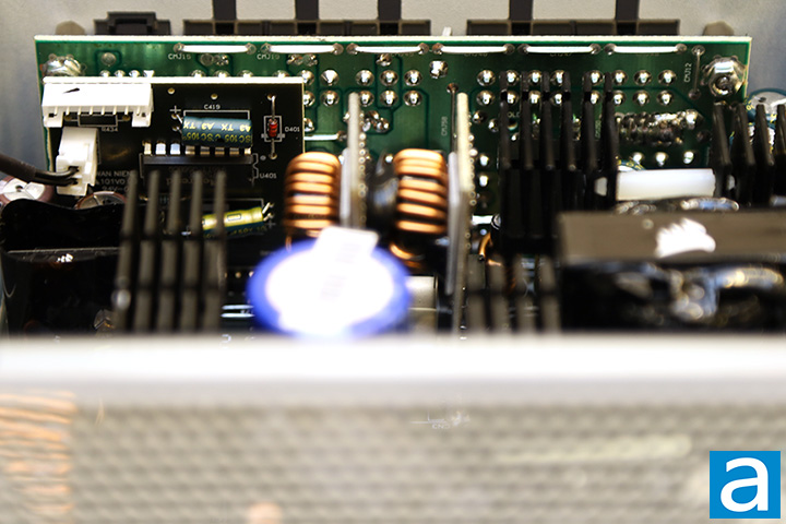 On the secondary side, we can see more capacitors rated at 105c. However, besides two United Chemi-Con, the rest are all Teapo. All rectifiers produce the +12V out, while the +5V and +3.3V outputs are generated from the +12V output using a DC to DC converter within as with modern high efficiency power supplies. Four Nexperia PSMN2R6-40YS MOSFETs are responsible for generating the +12V output, located at the bottom of the PCB, not shown. The PSMN2R6-40YS's rated continuous drain current is 100A at 100c. It has an RDS(on) value of 0.0028 ohm maximum and 0.0020 ohm typical at 25c. Four Potens Semiconductor PDD3906 MOSFETs on each of the two add-in boards, for a total of eight, generate the +5V and +3.3V output from the +12V rail. The PDD3906's rated continuous drain current is 51A at 100c. It has an RDS(on) value of 0.006 ohm maximum and 0.0048 ohm typical. ANPEC's APW7073 is the PWM switching controller; one on each add-in board for a total of two. Meanwhile, a Weltrend WT7527 monitoring IC provides over current and over/under voltage protection. The datasheets for all components mentioned in this review can be found on their respective manufacturer's websites.