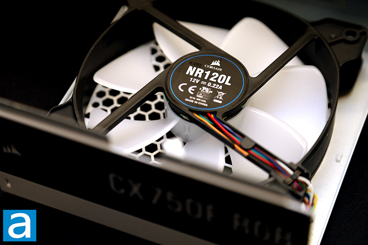 Lastly, we see a 120mm fan that provides cooling to the Corsair CX750F RGB 750W's internal components. It is connected to an add-in board using a 7-pin connector for its RGB lighting and fan speed control. A 120mm fan is rather small nowadays for a power supply with a bottom mounted fan, but if not a lot of heat is being generated, it should not be much of an issue. The fan is a Corsair NR120L RGB, as shown in our photo above. The NR120L has eight individually addressable RGB LEDs and is a rifle bearing fan specified at 0.22A. Its maximum rotational speed is 2200 RPM.