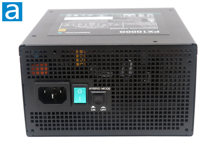On the back of the power supply, we have a similar square grid grille, albeit with much smaller openings this time around. We also have a horizontally aligned male connector for power input on one side of the unit with an on/off switch beside it. I do like that this power switch is colored in teal for a unique look. Finally, we have a push-button switch marked "Hybrid Mode", which turns on the zero RPM fan mode. This turns off the fan when the power supply is below a certain temperature and wattage. Otherwise, this ventilation area is important to allow heat to flow out of the back. Most modern power supplies have an automatic full range 110V to 240V AC line voltage selection, so there is no need for a manual switch, as seen on older power supply units without active PFC.