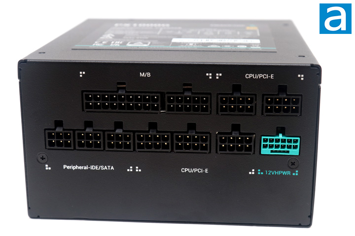 As for the rear cable connection panel, everything is clearly labeled and in the correct orientation. Similar connectors are grouped together and laid out in a logical manner. Starting from the top row on the left, we have a motherboard 24-pin split into two plugs. Immediately to the right of that are two 8-pin plugs for either the CPU or PCIe cables. On to the second row, we have three 6-pin plugs for peripheral connections like SATA or Molex. Next, we have three more 8-pin plugs for more CPU or PCIe connectors. Finally, we have a 16-pin 600W 12VHPWR PCIe 5.0 plug. One thing I do like is the fact it is quite tricky to accidentally plug the wrong cable into the wrong port, as none of them share the same physical plug as each other. This is a generally reasonable array of outputs in correspondence to the number of connectors on each modular cable, which should be sufficient for most users. Compared to the Thermaltake Toughpower GF3 1000W, this DeepCool power supply swaps out a peripheral connector for an extra CPU/PCIe connection.