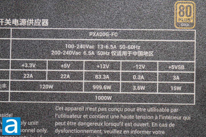 The voltage specification label is located on the outer panel of the DeepCool PX1000G 1000W. There are two main virtual rails. Up to 22A can be delivered via the +3.3V rail for a total of 72.6W, while the 22A on the +5V rail brings the output to 110W in this area. The total combined output for the +3.3V and +5V rail is 120W. In other words, your power allocation combination must fall within the limits of the listed specifications. Meanwhile, a single +12V rail delivers up to 83.3A for a maximum 999.6W. Overall, the combined power output for the whole DeepCool PX1000G 1000W is an unsurprising 1000W. It does sound a bit confusing to understand how this works at first, but generally speaking, this configuration allows fairly flexible power demands and should be sufficient to accommodate most users. I have seen higher power outputs in the +3.3V and 5V rails for similar rated units like the Thermaltake Toughpower GF1 1000W and Antec Signature Platinum 1000W, but the overall distribution is still reasonable for a 1000W power supply. Unsurprisingly, this is also the same power distribution as the aforementioned Toughpower GF3 1000W.
