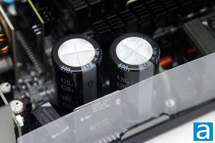 As for the primary capacitors, you can see two Japanese brand ones from Nichicon. Our DeepCool PX1000G 1000W power supply uses two 470µF x 420V for an equivalent capacitance of 940µF x 420V. They are rated at 105c, whereas more value-oriented power supplies usually use 85c rated capacitors.