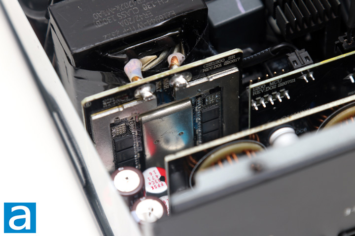 All rectifiers produce the +12V out, while the +5V and +3.3V outputs are generated from the +12V output using a DC-to-DC converter within the power supply unit. A total of eight Infineon BSC014N04LS MOSFETs generate the +12V output, located on a daughterboard near the secondary side of the transformer. Its rated continuous drain current is 125A at 100c. It has an RDS(on) value of 1.4 mΩ maximum and 1.1mΩ typical at 10V.