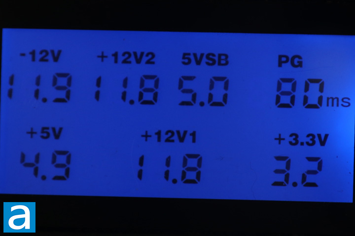 Voltages with minimal load are generally accurate, which is a basic requirement of power supplies out of the box. In this situation all are within 4%. This power supply is ATX 3.0 compliant and officially supports Alternative Sleep Mode with 100 to 150ms PG specifications, so it looks like the PSU tester I used was inaccurate when measuring the PG signal. The ATX design specifications state a PSU's PG is required to be between 100ms and 500ms, with 250ms maximum for Non-Alternative Sleep Mode and 150ms for Alternative Sleep Mode.