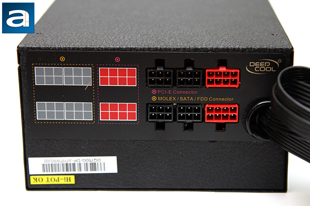 The rear cable connection panel is done nicely. Similar connectors are grouped together; and are laid out in a very simple manner. To ensure you know what is going on, a diagram is situated on the left for minimal ambiguity. The left group are peripheral connectors, while the two red connectors on the right are for the PCI Express cables. This is it. Incompatible outputs will not physically fit into each other, so I think Deepcool has done a great job in this regard. This simple array of available connectors should be more than sufficient for casual users and power enthusiasts alike.