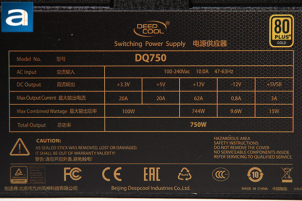 The Deepcool Quanta DQ750 750W is 80 Plus Gold certified, which means that it is certified to be at least 87%, 90%, 87% efficient at 20%, 50%, and 100% load, respectively. Higher certifications available for power supplies of this type include 80 Plus Platinum and 80 Plus Titanium at press time.