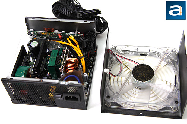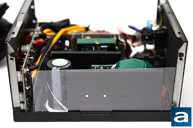 At the back, we have a large daughterboard covering the entire rear panel for the modular cable sockets. Here, we can see parts of the DC to DC converter, where we have an ANPEC APW7159 synchronous buck PWM controller for each rail. Four Advanced Power Electronics AP72T03GH MOSFETs are responsible for the minor rail generation. The AP72T03GH's rated continuous drain current is 44A at 100c, and a pulsed drain current of 190A. Drain source voltage is rated at 30V, and a RDS(on) value of only 0.008 ohm. This is completed in conjunction with the minor rail generation done by voltage regulator modules on the modular PCB to further improve efficiency. The datasheets for all components mentioned in this review can be found on their respective manufacturer's websites.