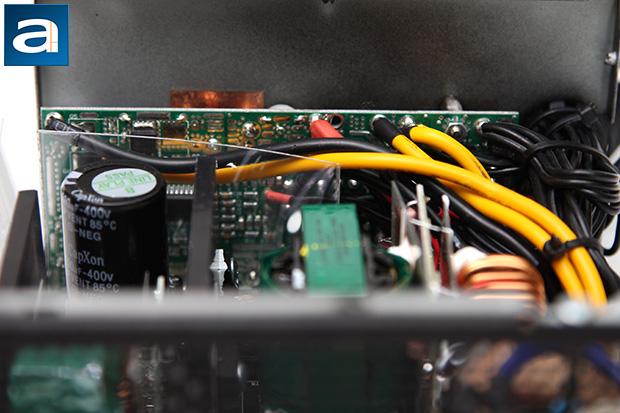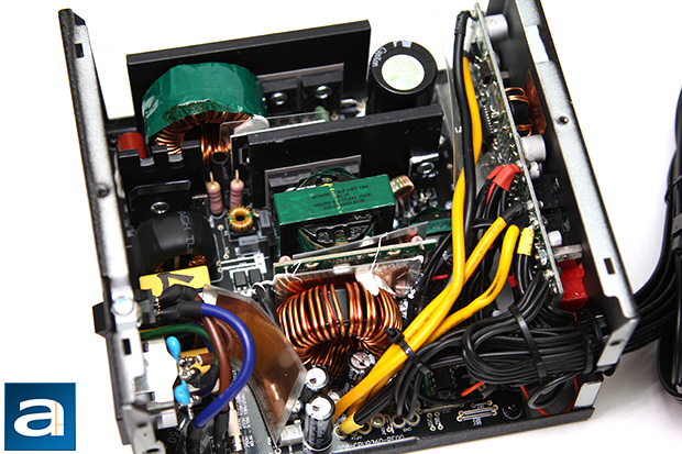 Disassembling the Deepcool Quanta DQ750 750W was quite straightforward, with the removal of six screws. Two were located at the top, with four on the sides. The Quanta DQ750 750W's OEM is Channel Well Technology (CWT), a reputable OEM since 1993. It was the OEM to PSUs like the Thermaltake Toughpower XT Platinum 1275W and Thermaltake SMART M750W. Our photo above shows an overhead view of its internal components. At first glance, the build quality appears to be excellent, as one would expect from the company. There are only three heatsinks inside the DQ750; all of which are painted black, and are compact in size.