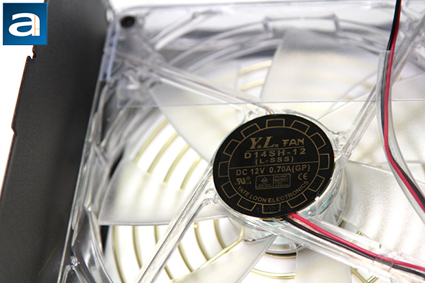 Lastly, we see a 140mm fan that provides cooling to the Deepcool Quanta DQ750 750W's internal components. It is connected to the mainboard using a 2-pin connector. A 120mm fan is rather small nowadays for a power supply with a bottom mounted fan, but if not a lot of heat is being generated, it should not be much of an issue. A 140mm fan is probably the largest one you can fit inside a standard ATX power supply, and it is beneficial in most cases in providing lots of airflow at lower speeds for quiet operation. Yate Loon is the fan OEM, with D14SH-12 as the model number, as shown in our photo above. This is basically the larger, blue LED variant of the D12SH-12 used in the SilverStone Strider Essential Gold ST70F-ESG 700W. Further research indicates the D14SH-12 is a hybrid ceramic ball bearing fan specified at 0.70A for a maximum of speed of 2800 rpm. The rated airflow is 140 CFM at 48.5 dB of noise.