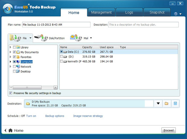After clicking the text link under Data Backup, we are treated with the backup screen, where we are given a choice of the directories and drive to choose from. The GUI here is fairly standard stuff. The three tabs found above the file selection are different sections, including partitions and email backup. If you don't use Microsoft Outlook as your mail client, you will be unable to save your messages using EaseUS’ Todo Backup program. Also, found in this screen is the ability to select specific files and folders you may want to back up, including stuff stored on external storage devices. Surprisingly, this includes network folders (In addition to your main computer, obviously), assuming one has some network storage. At the bottom, it is also possible to set the destination folder for the backup, which is, by default, your secondary drive’s main directory under My Backups. This is no different from other popular backup programs such as Acronis True Image.