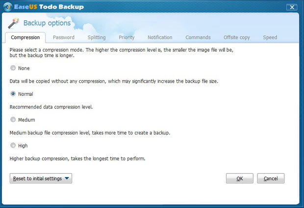 After the Backup options text link found below the destination folder selection pops up a new dialog with additional settings. The tabs found at the top are as listed from left to right: Compression, Password, Splitting, Priority, Notification, Commands, Offsite Copy, and Speed. Compression allows the user to pick between four settings, from ‘None’ to ‘High’, which can affect how long it takes to create a backup, and how large the backup archive is. Password is pretty self explanatory -- it adds a password to the archive. Splitting allows users to automatically split the images to smaller files for specific media such as CDs or DVDs. Priority sets how much overall CPU and RAM usage the software can use to create the backup. Notifications can be configured to send an email to a specific email account when the backup process is completed. Commands are additional tasks that can be added before or after the backup. Offsite copy allows you to remotely upload the file to an FTP server; also relevant is the Speed tab, which sets the maximum network transfer speed. From the features here, we can see the software is pretty flexible in terms of usage, and we have come to expect such if you have used competing programs in the past.