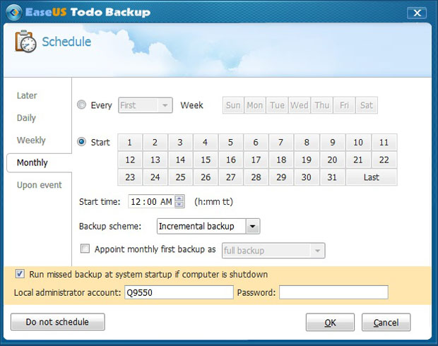 Scheduling is an important feature. Being able to have the program set up automatic backups is convenient, if not crucial, and is needed in bigger scale usages and is just as good for the standard user. After all, I am a “set it and forget it” kind of guy when it comes to automatic backups, and without this feature, it could be a real pain in the butt. You can schedule your task to a later date in a daily, weekly, and/or monthly configuration. There is just a lot of flexible here in terms of when a backup task is to be executed, and definitely a “set and forget thing" as our Editor-in-Chief would put it. The most interesting feature is the ability to make it back up on certain events. This includes system startup, user log on, and user log off. These choices can be made to do once a day, or on a specific date only. At the bottom, there is a space for the user to input their username and password to ensure backups are made on next startup if they are missed, when say the computer is shut down. Please note that you will need to have this box checked in Windows 8 to have regular scheduling functions working correctly, otherwise, it will not execute automatically.