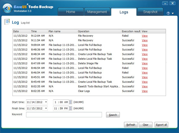 The log portion is one of my favorite features in EaseUS’ Todo Backup software. Logs include just about everything you would ever want to know, such as successful and failed past backups and recoveries. These are all date and time-stamped to give peace of mind and the ability to make sure everything is running smoothly, even when away from the computer. The most interesting thing is the logging of when you started up the program, and even when you quit it. I am not too sure why this would be needed in terms of logging purposes, but I guess it could be used in making sure others don't mess around with your computer; or at least not screw around with your backup software.