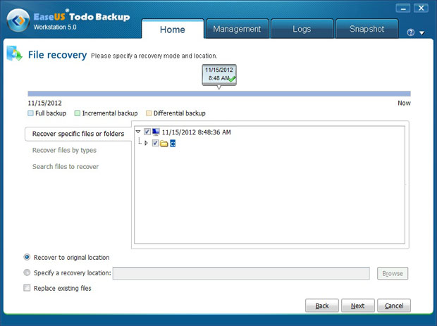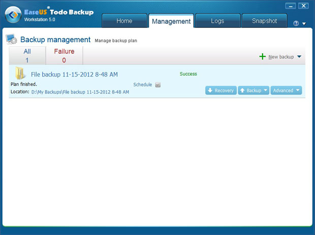 The Management tab is where all the past successful and failed backups are tracked. This would include any automatically scheduled backups and manual backups. Additional options can be found here, such as scheduling a regular interval of backing up the selected files, as well as the ability to add notes to the backed up archive, so it is easier to remember keep track of which is what. The recovery button is pretty much self explanatory. For what it is worth, the features here are pretty useful, and works well for most user's backup and management needs.