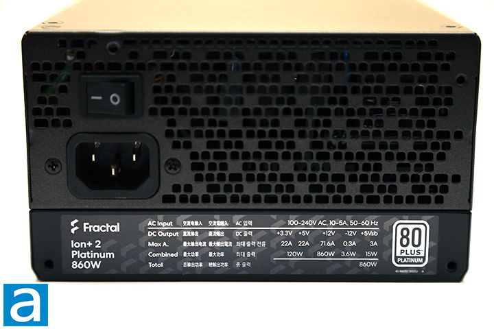 Starting from the back part of the power supply, we have the unique dot code mesh design as aforementioned; what you will find here is a horizontally aligned male connector for power input on the western edge along with an on/off switch above it. The low resistance mesh design is implemented to maximize airflow and minimize air resistance. This is done as heat needs to leave the power supply as easily and efficiently as possible, because the Ion+ 2 Platinum 860W incorporates only one 140mm fan at the bottom. The mesh is not very large though, since the bottom 2.5cm is occupied by a specifications label. This is the second time I have seen anyone place a specifications label in this location, with the first being the Ion+ Platinum. As with all active PFC power supplies, the Ion+ 2 Platinum 860W has an automatic full range 100V to 240V AC line voltage selection, so the user does not have to worry about manually selecting the input voltage.