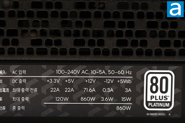 The voltage specification label is located on the outer panel of the Fractal Design Ion+ 2 Platinum 860W. There are two main virtual rails. Up to 22A can be delivered via the +3.3V rail for a total of 72.6W, while the 22A on the +5V rail brings the output to 110W in this area. The total combined output for the +3.3V and +5V rail is 120W. In other words, your power allocation combination must fall within the limits of the listed specifications. Meanwhile, a single powerful +12V rail delivers up to 71.6A -- 860W -- to maximize power delivery flexibility compared to multiple rails. Overall, the combined power output for the whole Fractal Design Ion+ 2 Platinum 860W is... well, 860W haha. It does sound a bit confusing to understand how this works at first, but generally speaking, this configuration allows sufficiently flexible power demands and should be sufficient to accommodate most users. I have seen lower power outputs in the +3.3V and 5V rails for higher output rated units. The overall distribution is very reasonable for an 860W power supply.