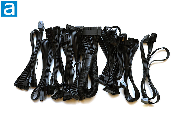 A total of ten modular power cables are included out of the box. These UltraFlex cables are designed to be thinner and more flexible without reducing efficiency or current capacity. All modular cables other than the ATX 20+4-pin cable are flat and easy to bend, making them extremely easy to work with. The ATX 20+4-pin cable is sleeved rather than flat. 16 AWG wires are found on the ATX/EPS 4+4-pin and PCIe 6+2 pin bundles. Everything else is 18 AWG, which is common and expected with modern power supply units.
