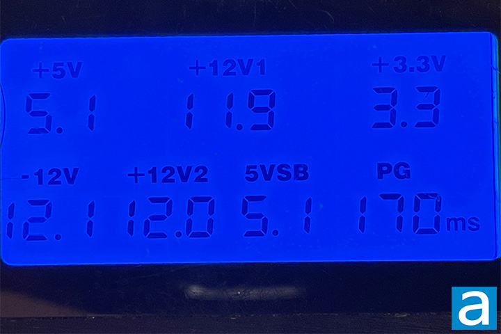 Voltages with minimal load are generally accurate, which is a basic requirement of power supplies out of the box. In this situation all are within 4%. The Power Good or PG delay is tested at 170ms, which is compatible with Non-Alternative Sleep Mode per ATX specifications. The ATX design specifications state a PSU's PG is required to be between 100ms and 500ms, with 250ms maximum for Non-Alternative Sleep Mode and 150ms for Alternative Sleep Mode.