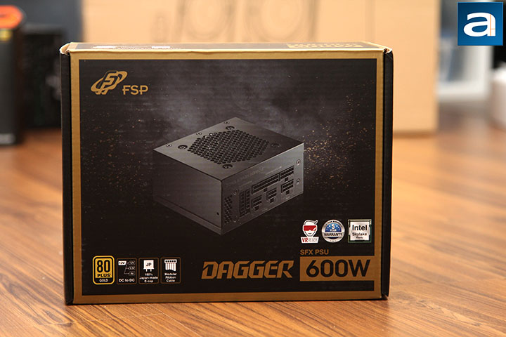 The FSP Dagger 600W's retail box design carries forward some resemblance from past products we have reviewed from the company, even though it has been quite a number of years since I have last taken apart a power supply from them. The predominantly black background is highlighted in gold around the perimeter, creating a slick contrast in presenting its 80 Plus Gold certification. FSP's logo can be found at the top left corner, while the bottom right corner has the "Dagger 600W SFX PSU" branding. An array of badges highlight its DC to DC converter, 100% Japanese E-caps, modular ribbon cables, VR ready, 5-year warranty, and Intel Skylake compatibility. I think the 100% Japanese E-cap badge -- probably E for Electrolytic -- is a bit misleading, because the Dagger 600W has polymer capacitors from Chinese manufacturer CapXon inside; more on this later. In the middle is a photo of the power supply in three quarter view. I do not think it is smoke coming out of the power supply in the photo, but it was definitely what I was thinking at first glance, haha. The remainder of the sides of the box contains feature highlights and specifications of the Dagger.