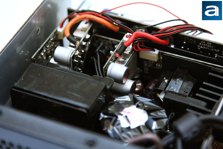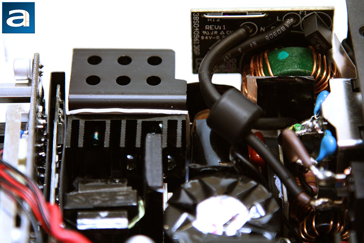 The active PFC circuit featured on the FSP Dagger 600W uses one Diodes Incorporated GBU1506U glass passivated bridge rectifier attached to one side of what is barely a heatsink. At 115V, the maximum rectified forward current capacity with heatsink is 15A, so you can theoretically pull up to 1725W (15A * 1 diode * 115V) from the bridge rectifier at 100% efficiency -- of course, this is limited by the fact that it is not 100% efficient, and neglects the fact that not every component in the system are able to keep up. Two STMicroelectronics STF24N60M2 N-channel MOSFETs located on the larger heatsink are used on the active PFC circuit on the FSP Dagger 600W power supply, with a Cree C3D06060A Schottky diode. This rectifier is certified for up to 9.5A at 135c. Two Toshiba TK16A60W MOFSETs can also be found on the smaller aluminum heatsink, with a Champion CM6901 LLC resonant controller to boost efficiency. Each STMicroelectronics STF24N60M2 MOFSET can deliver up to 12A at 100 degrees Celsius continuously. These transistors present a maximum resistance of 0.19 ohm when turned on; with a typical resistance of 0.168 ohm according to the manufacturer's data sheet. The Toshiba TK16A60W MOSFETs can deliver up to 15.8A at 25 degrees Celsius continuously (The specifications for 100c were not listed); with a maximum resistance of 0.19 ohm and a typical resistance of 0.16 ohm. This on characteristic is called Static Drain-Source On-Resistance, or commonly abbreviated as RDS(on). The more efficient the component is, the lower the RDS(on) value, since it wastes less power with lower resistance.