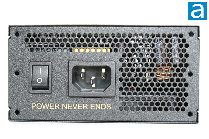 Looking at the exposed side of the power supply, we can see the power input and switch. Both the receptacle input and switch are standard, so a power cord can be reused from another device if necessary. The text under the switch and receptacle says, “Power Never Ends”. It is important to keep in mind the thickness of the power cord you decide to use, although the recommended thickness for the FSP Dagger Pro 850W is not specified, since this is not a very high wattage unit. The low resistance honeycomb pattern is implemented to maximize airflow and minimize air resistance. The FSP Dagger Pro 850W has automatic full range 100V to 240V AC line voltage selection like with all active power factor correction or APFC power supplies, so users do not have to worry about manually input voltage.