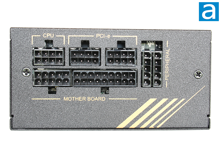 The back of the power supply contains the connection panel. The sockets are easy to identify thanks to the labels indicating, which cord goes where. Starting at the top and going from left to right, we have an 8-pin CPU and two 8-pin PCIe cable headers. At the bottom, we have the two halves of the 20+4-pin motherboard connector header. Finally, on the right-hand side, we have two 5-pin peripheral cable headers. As with most power supplies, the design of these connectors is great with different pin configurations. This makes it so you do not have to risk plugging in a cable to the wrong port.